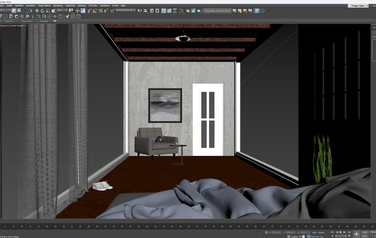 A visualização das superfícies em modo "clay" (argila) facilita o entendimento das arestas básicas do projeto.