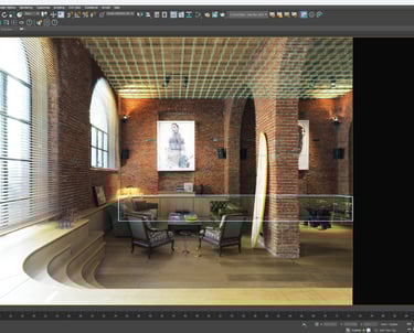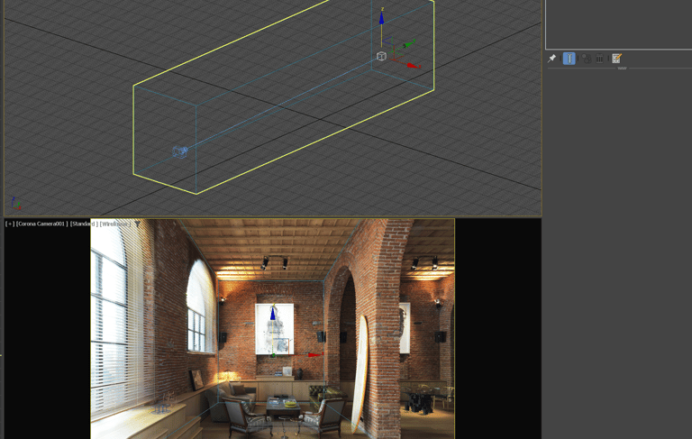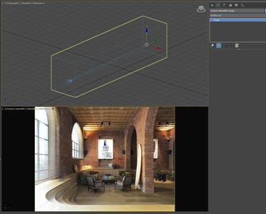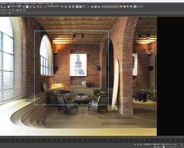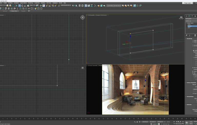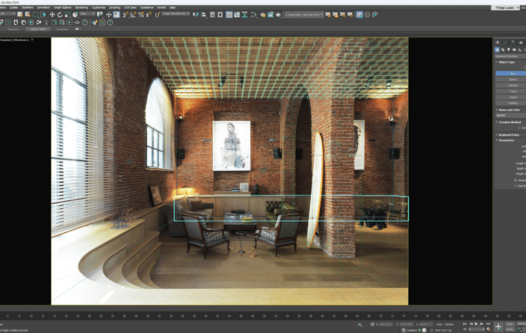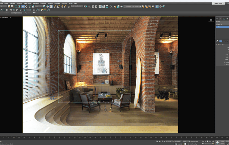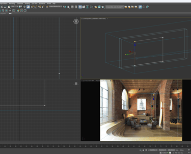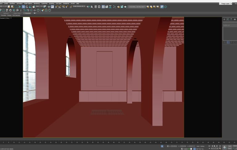 Espaçamento para as vigas do teto e desenho da bancada. Todas estas referências são feitas no 3ds. Utilizei o Photoshop, no início, para ter um parâmetro de altura e pé direito.