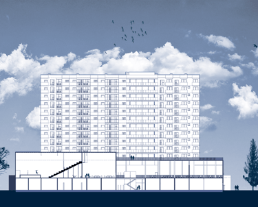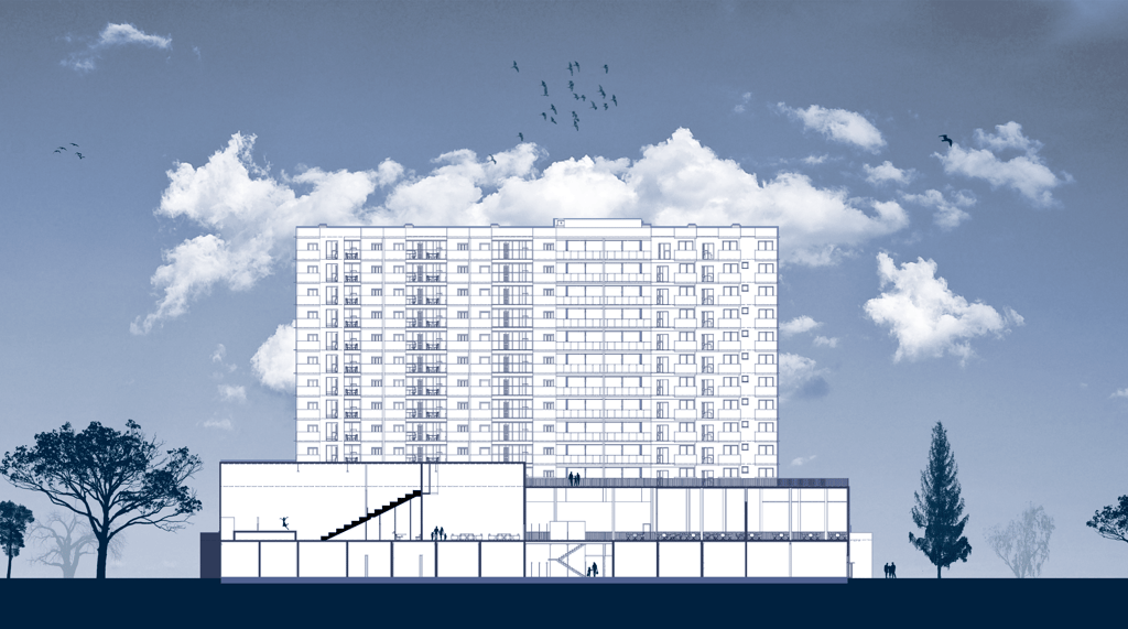A base comercial se dará por um teto maior do que o pavimento térreo. Ao mesmo tempo proporciona liberdade e ausência de estruturas para aquele pavimento, como também espaço para o desenvolvimento de terraços ativos nos níveis superiores.