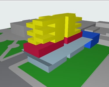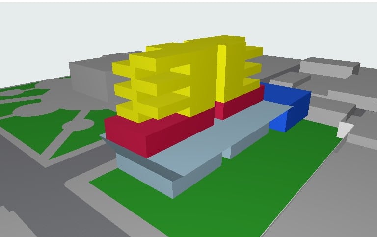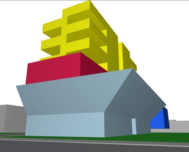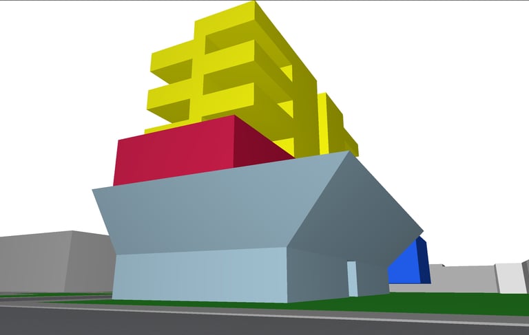 Conjugando as qualidades das duas inspirações, pretendi desenvolver algo que ao mesmo tempo tivesse o zoneamento inteligente do Conjunto Nacional mas que, também, possuísse uma fachada mais dinâmica, como o Edifício Sede da Petrobrás. As áreas em azul claro são do setor comercial, azul escuro auditório, vermelho hotelaria e amarelo residencial.