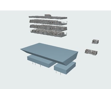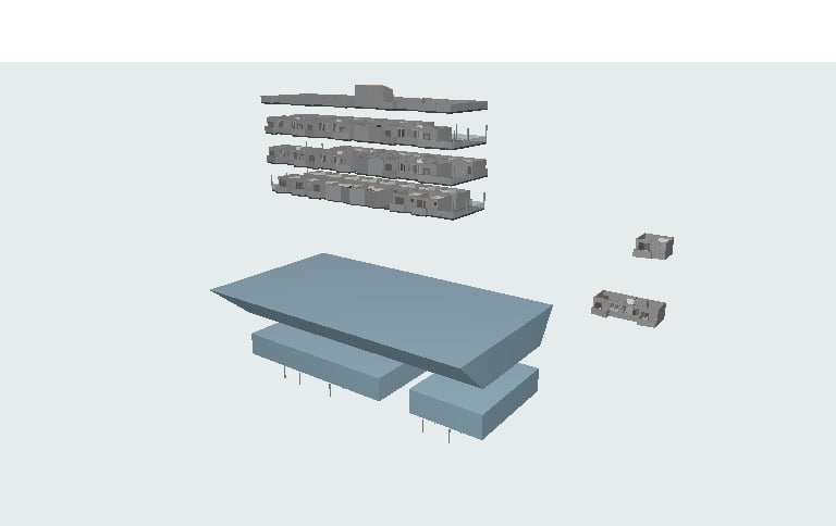 A ferramenta de módulos associados é fundamental no Archicad. Dividindo o modelo em camadas, é possível, com um só comando, alterar, por exemplo, a posição de um pilar em toda construção. A estrutura de trabalho básica é um arquivo raiz com os tipos montados, como o da foto ao lado, eu um arquivo final, que será o que efetivamente vai para a apresentação.