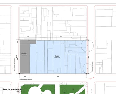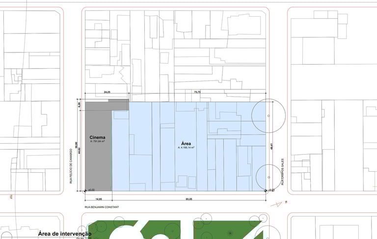 Próximo à estação da CPTM, já demonstra suas condicionantes, como a Igreja (antigo Cinema Saci) situado na face oeste do terreno.