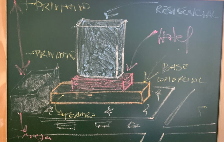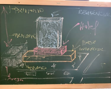 Sou fascinado por giz, sempre fui. Adorava ver os tipos de letras dos professores que me ensinaram ao longo da vida brotando na lousa. Entre várias técnicas utilizadas no processo criativo, acho o giz uma das mais versáteis. Basta desenhar, apagar o que não deseja, refazer algumas pontuações, tirar uma foto e pronto, processo registrado. Claro, sempre com o sketchbook à mão para documentar o andamento. Na foto vemos a conceituação inicial, partindo de um térreo mais extrovertido e, à medida que subimos para os pavimentos superiores, a introversão se faz visível e os pavimentos são acessíveis somente a moradores ou hóspedes na base do hotel.